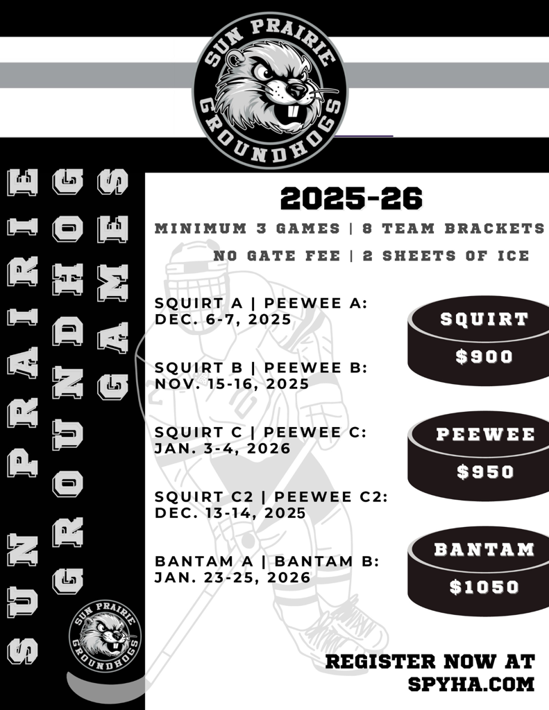 The Sun Prairie Groundhog Games is a series of tournaments for Squirts, PeeWees, and Bantams in November & December 2025 and January 2026. Final brackets will be released 10-14 days before the respective tournament weekend.